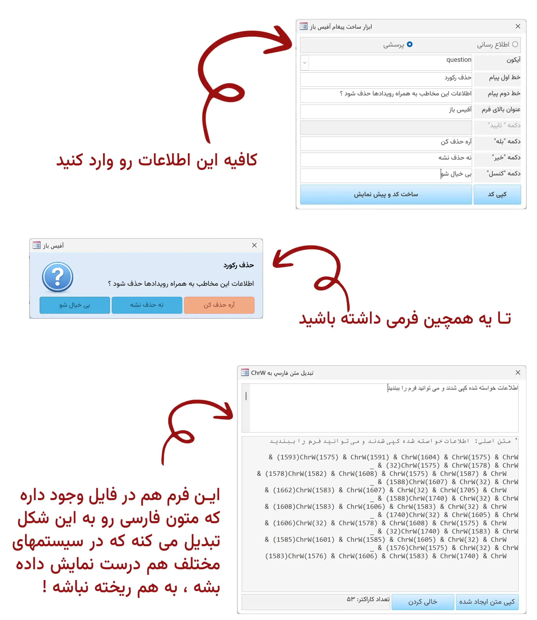 شایان ذکر است که ساخت پیغام فارسی در Access توسط این ابزار را کامل به همراه مثال که چجوری تو پروژه خودتون استفاده کنید داخل فایل دانلودی فارسی سازی اکسس قرار داده ام.